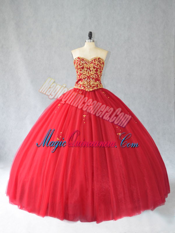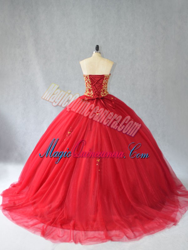 Lace Up Quinceanera Gowns Red for Sweet 16 and Quinceanera with Beading Brush Train