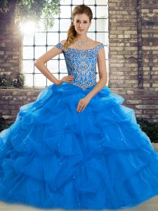 Lace Up Sweet 16 Dresses Blue for Military Ball and Sweet 16 and Quinceanera with Beading and Pick Ups Brush Train