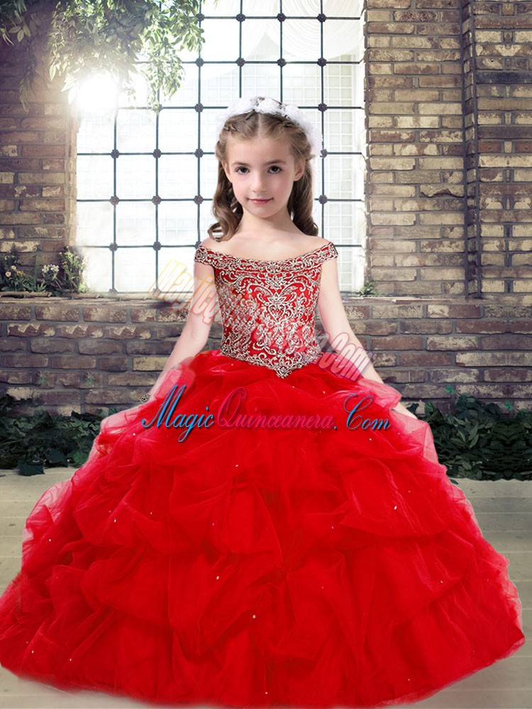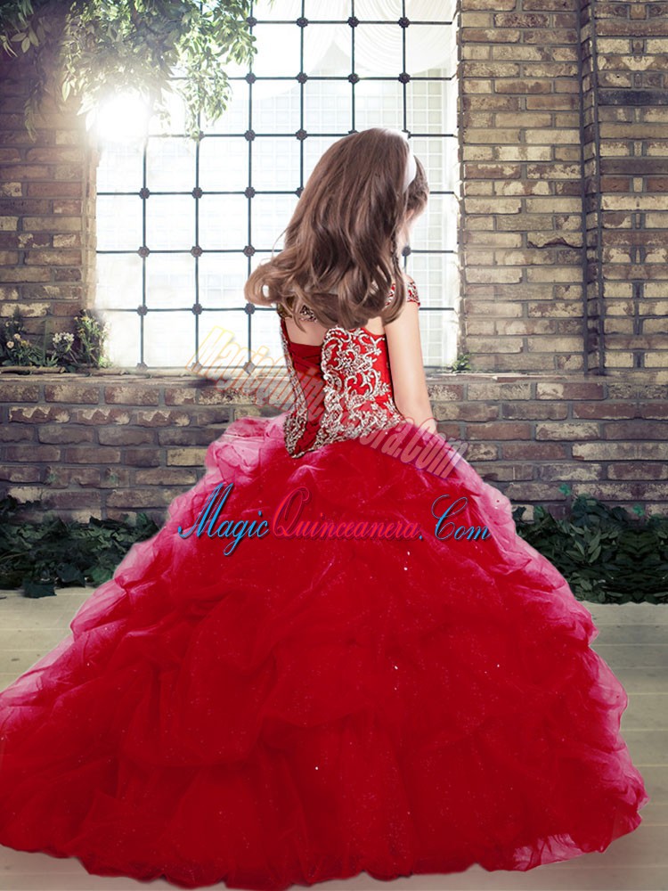 Latest Floor Length Lace Up Pageant Dress for Teens Red for Party and Military Ball and Wedding Party with Beading