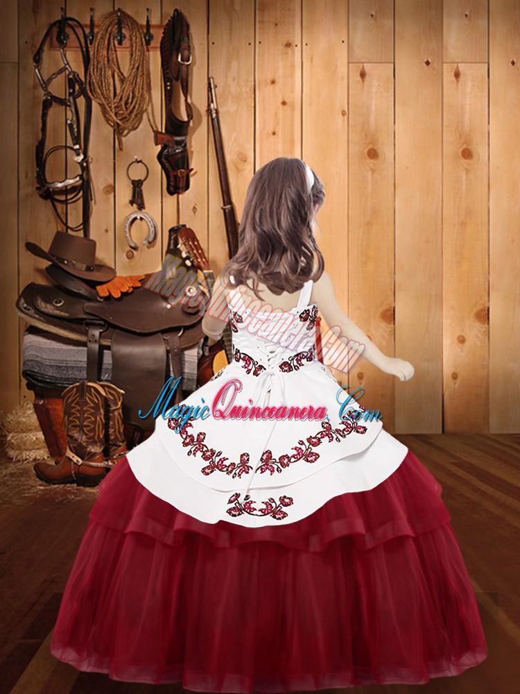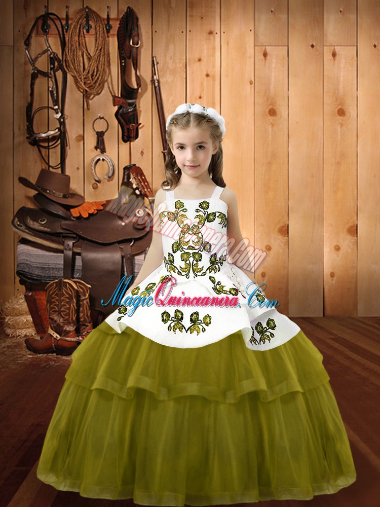 Latest Olive Green Straps Lace Up Embroidery Pageant Dress for Teens Sleeveless