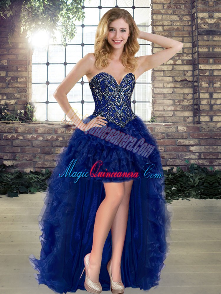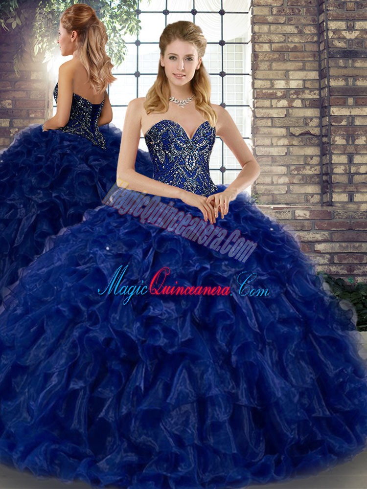 Latest Royal Blue Three Pieces Organza Sweetheart Sleeveless Beading and Ruffles Floor Length Lace Up Sweet 16 Dress