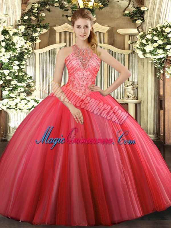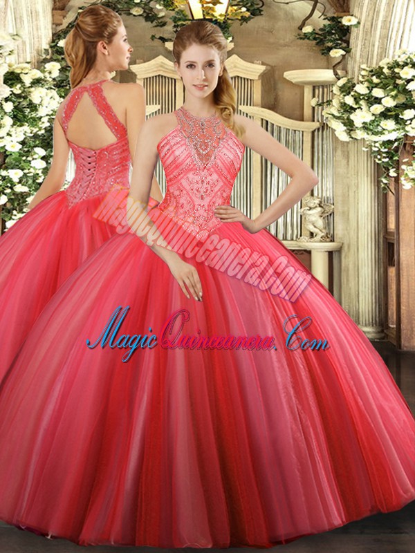 Latest Sleeveless Floor Length Beading Lace Up Quinceanera Gowns with Coral Red