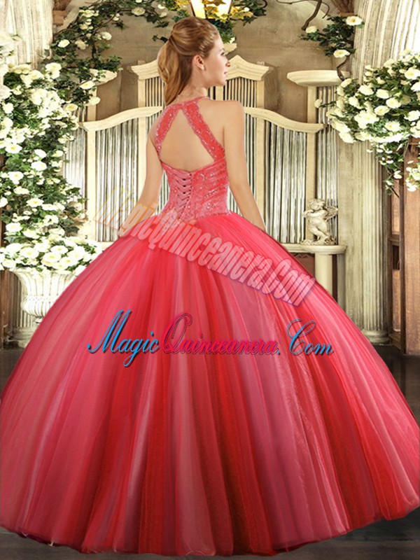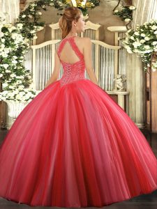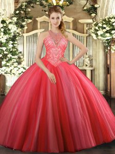 , Latest Sleeveless Floor Length Beading Lace Up Quinceanera Gowns with Coral Red