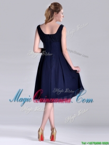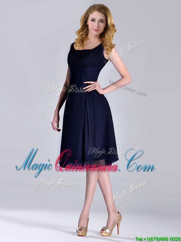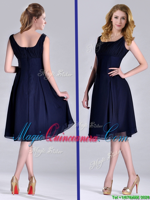 Latest Square Empire Chiffon Navy Blue Dama Dress with Ruching