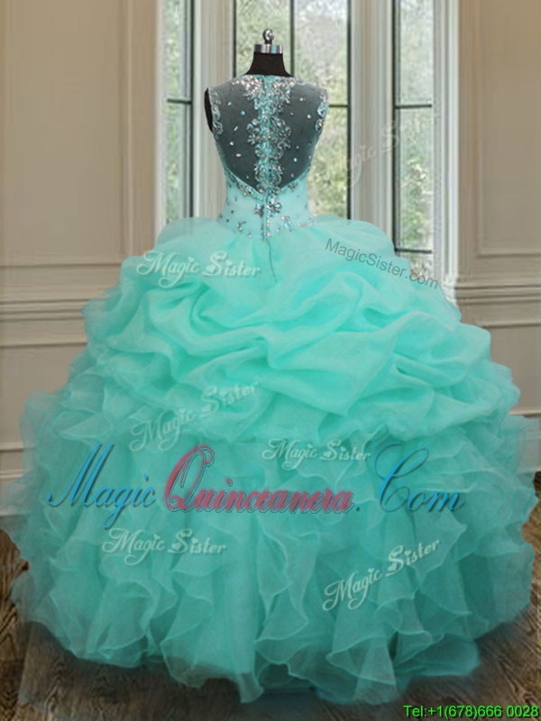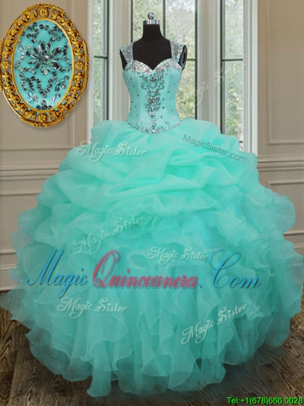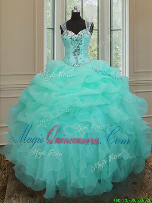 Latest Straps Straps Floor Length Apple Green Quince Ball Gowns Organza Sleeveless Beading and Ruffles