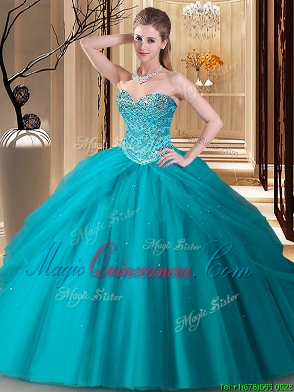 , Latest Teal Sleeveless Beading Floor Length 15th Birthday Dress