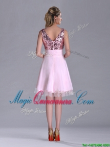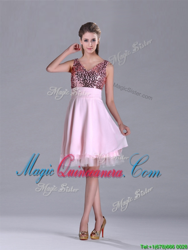 Latest V Neck Sequined Decorated Bodice Dama Dress in Baby Pink
