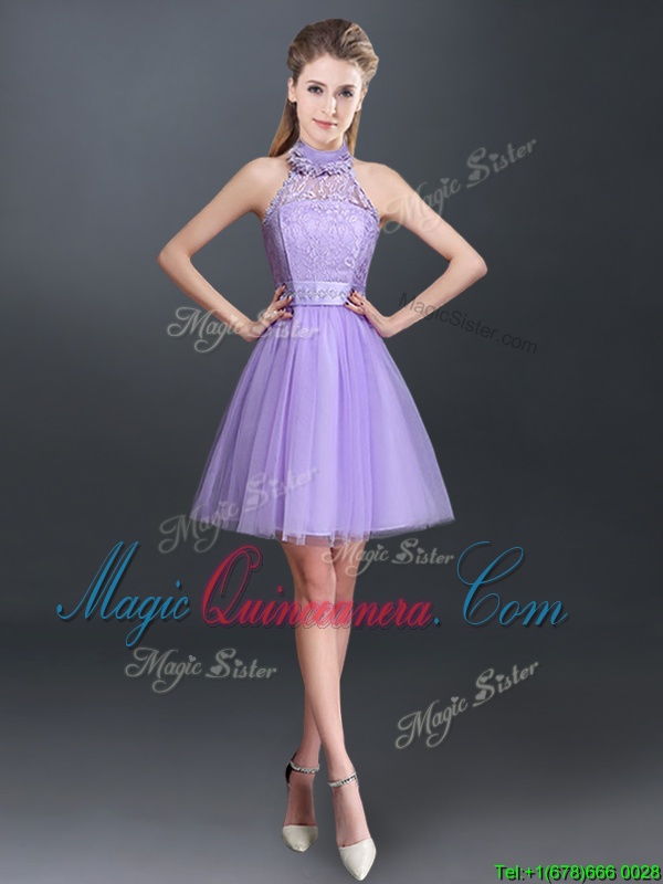 Lavender A-line Tulle Halter Top Sleeveless Lace and Appliques Mini Length Lace Up Quinceanera Court Dresses - Magic Quinceanera