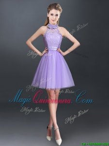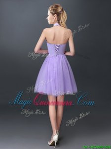 Lavender A-line Tulle Halter Top Sleeveless Lace and Appliques Mini Length Lace Up Quinceanera Court Dresses