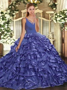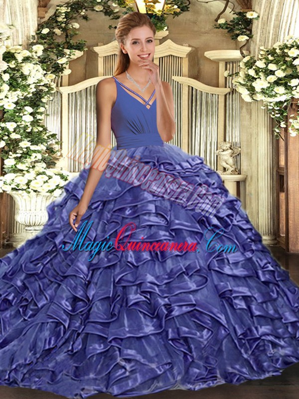 Lavender Backless V-neck Ruffles 15 Quinceanera Dress Organza Sleeveless Sweep Train