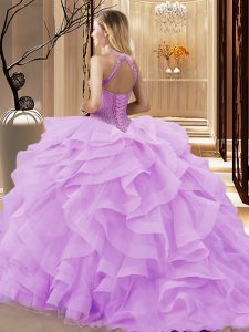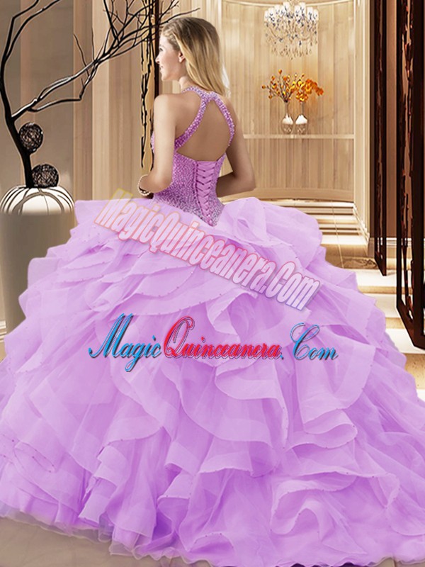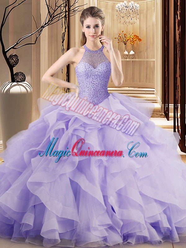 Lavender Ball Gowns Organza Halter Top Sleeveless Beading and Ruffles Lace Up Quince Ball Gowns Sweep Train