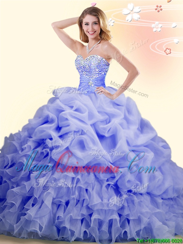 Lavender Ball Gowns Organza Sweetheart Sleeveless Beading and Ruffles and Pick Ups With Train Lace Up Sweet 16 Quinceanera Dress Brush Train