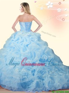 Delicate Pick Ups With Train Ball Gowns Sleeveless Baby Blue Quinceanera Gowns Brush Train Lace Up