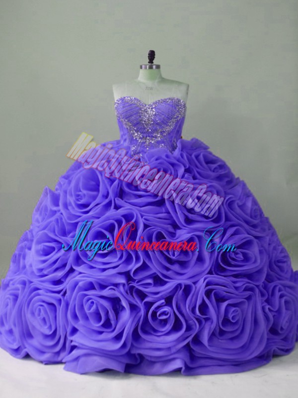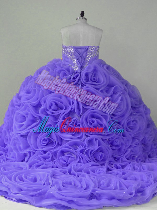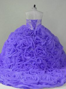 Lavender Fabric With Rolling Flowers Lace Up Vestidos de Quinceanera Sleeveless Brush Train Beading