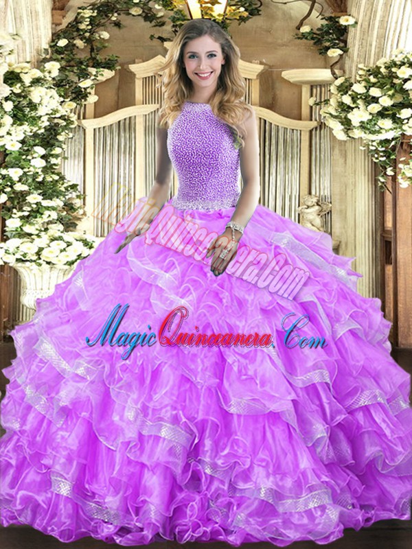 Lavender Lace Up High-neck Beading and Ruffled Layers Sweet 16 Quinceanera Dress Organza Sleeveless