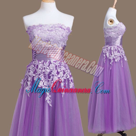 Lavender Lace Up Quinceanera Court of Honor Dress Appliques Sleeveless Tea Length