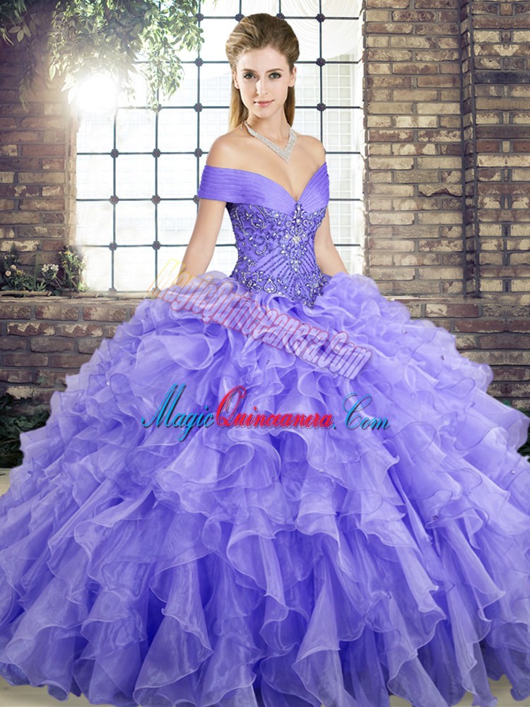 Lavender Organza Lace Up Off The Shoulder Sleeveless Sweet 16 Quinceanera Dress Brush Train Beading and Ruffles