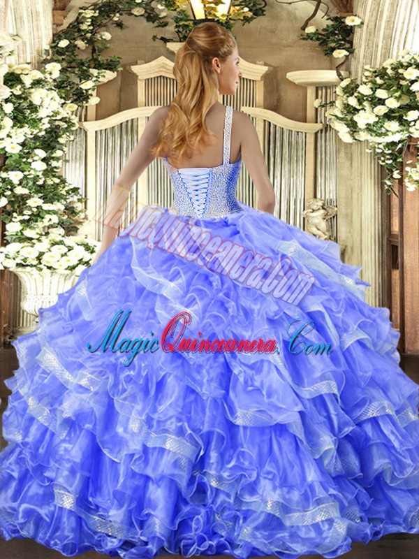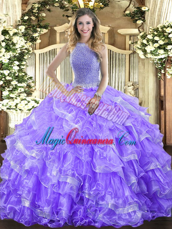 Lavender Organza Lace Up Quinceanera Gown Sleeveless Floor Length Beading and Ruffled Layers