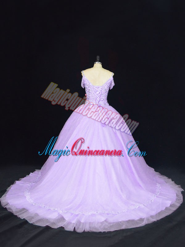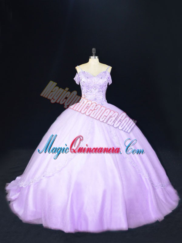 , Lavender Sleeveless Court Train Beading Quince Ball Gowns