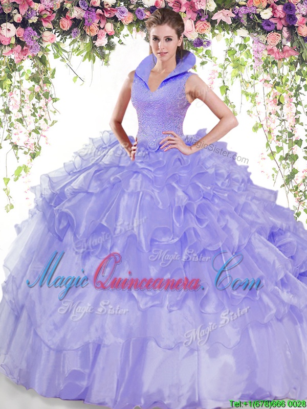 Lavender Sleeveless Beading and Ruffles Backless Vestidos de Quinceanera