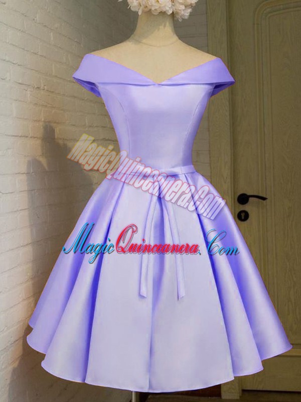 Lavender Taffeta Lace Up Off The Shoulder Cap Sleeves Knee Length Vestidos de Damas Belt