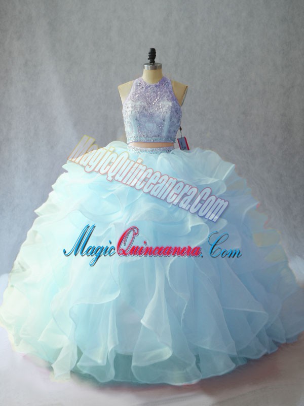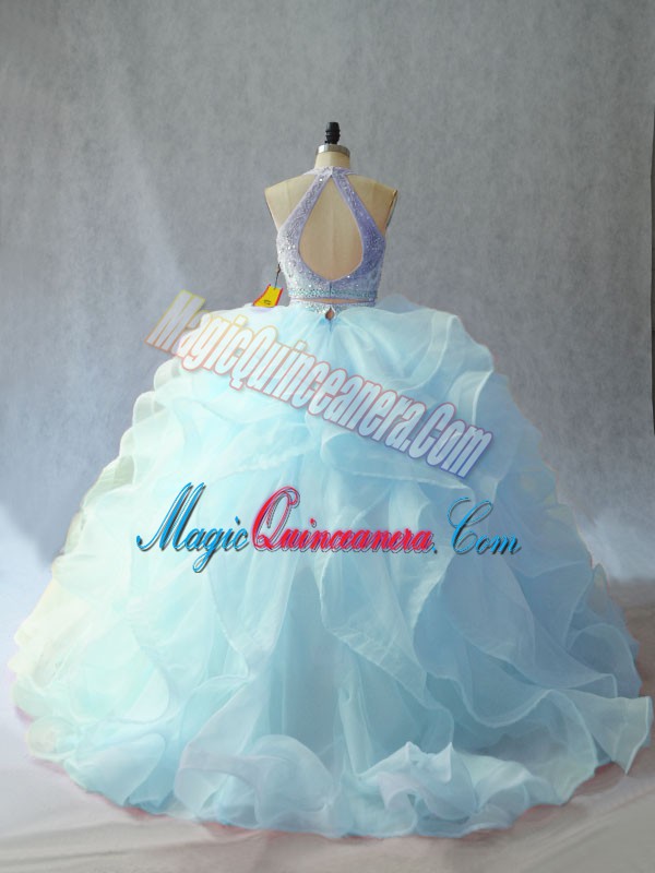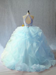 Light Blue Backless Scoop Beading and Ruffles Sweet 16 Dress Organza Sleeveless Brush Train