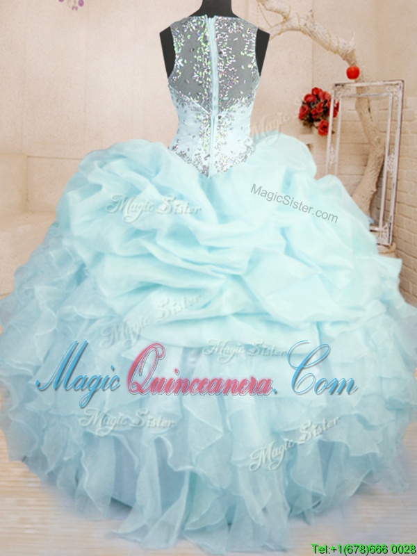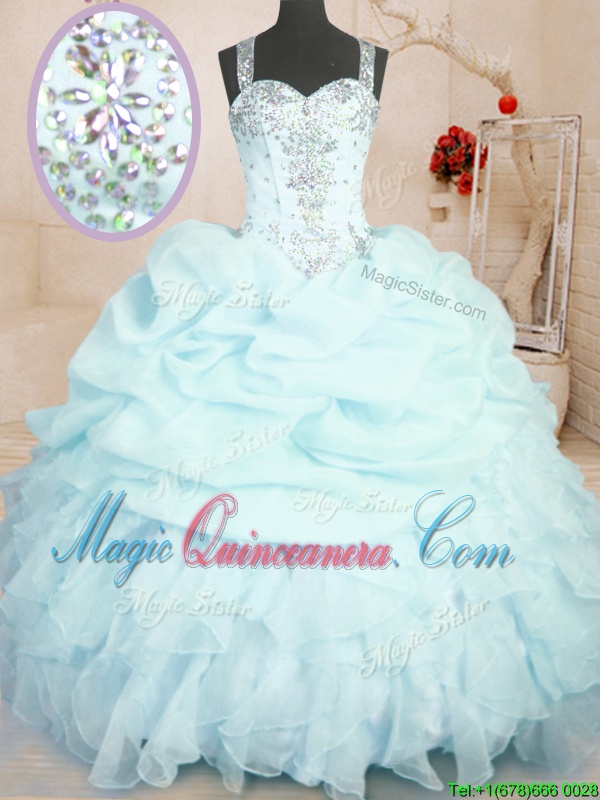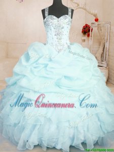 Light Blue Ball Gowns Organza Straps Sleeveless Beading and Ruffles and Pick Ups Floor Length Zipper Quinceanera Gown