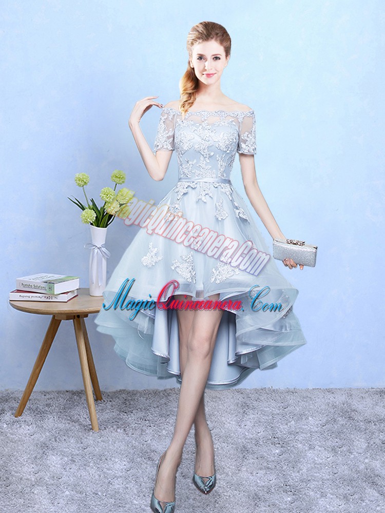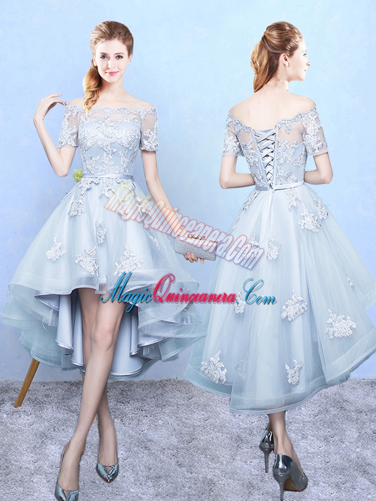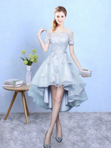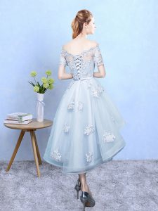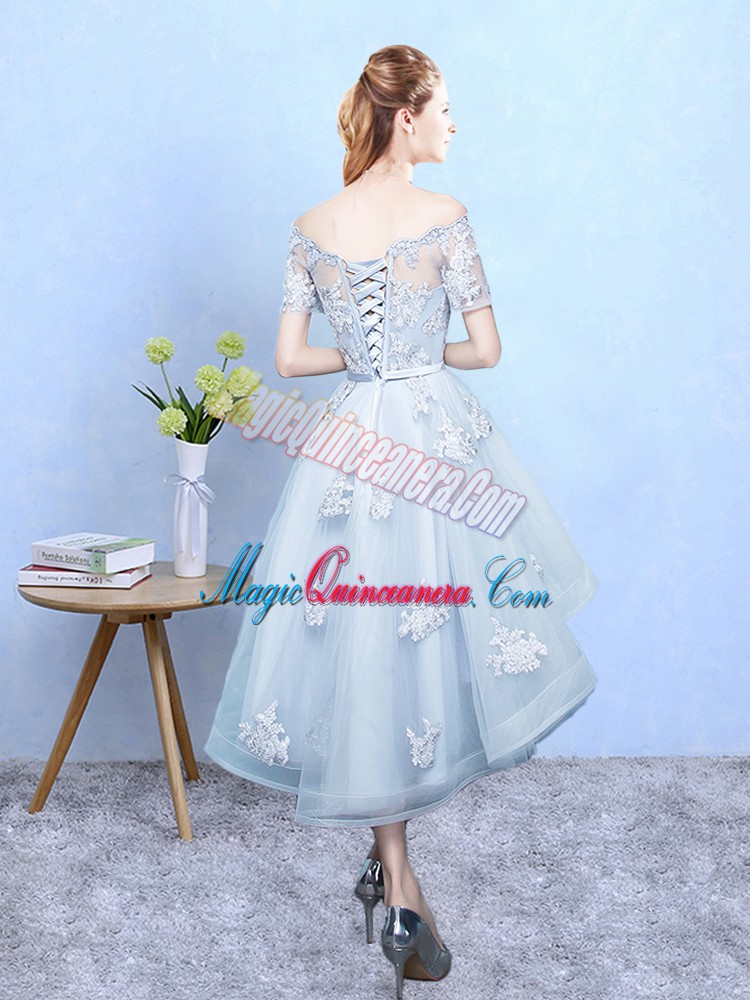 , Light Blue Off The Shoulder Lace Up Lace Court Dresses for Sweet 16 Short Sleeves