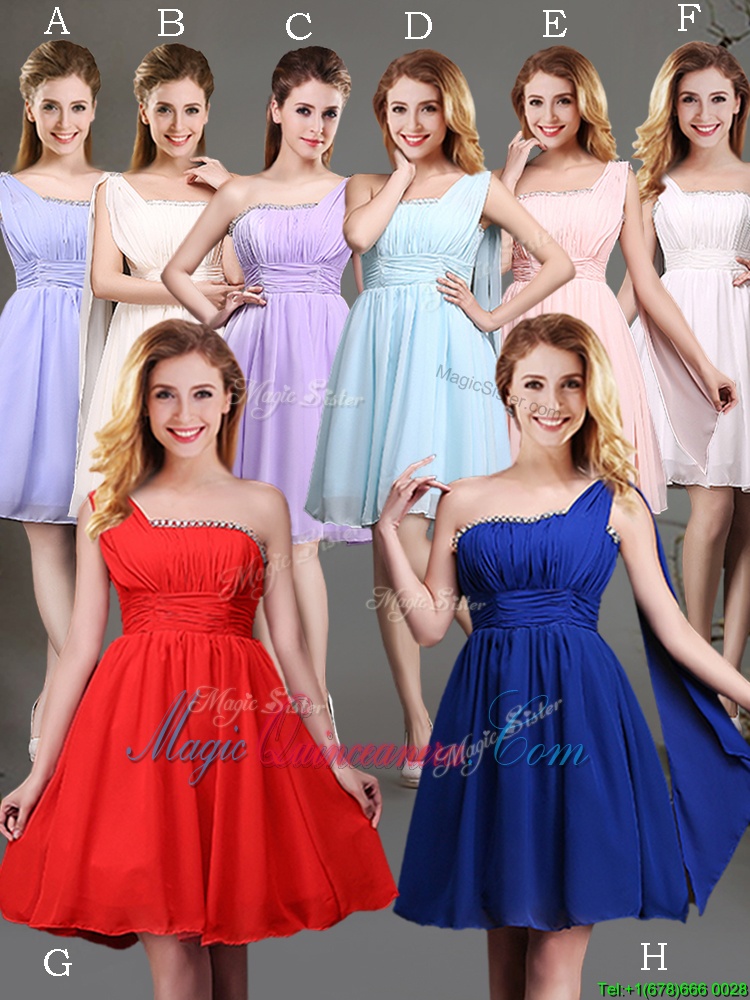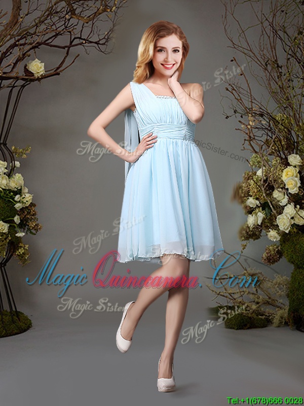 , Light Blue One Shoulder Neckline Beading and Ruching Dama Dress Sleeveless Zipper