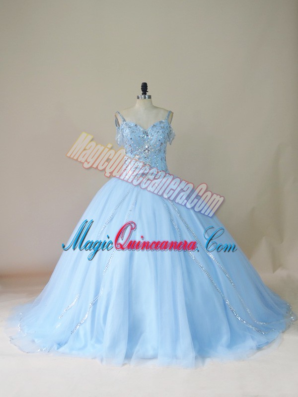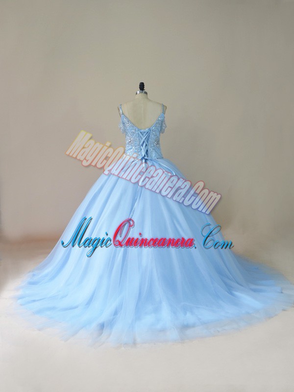 Light Blue Sleeveless Brush Train Beading Quinceanera Dress