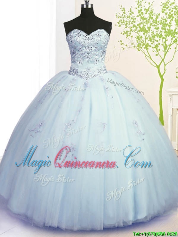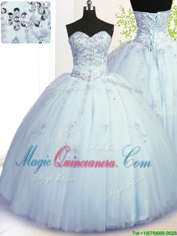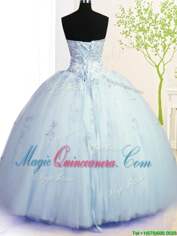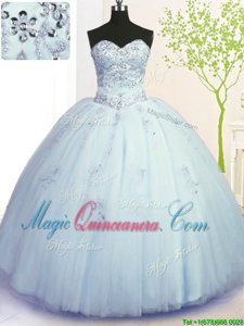Light Blue Sleeveless Floor Length Beading and Appliques Lace Up Vestidos de Quinceanera