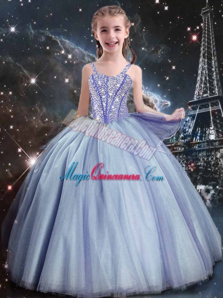 , Light Blue Sleeveless Floor Length Beading Lace Up Little Girls Pageant Gowns