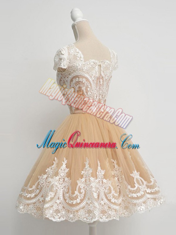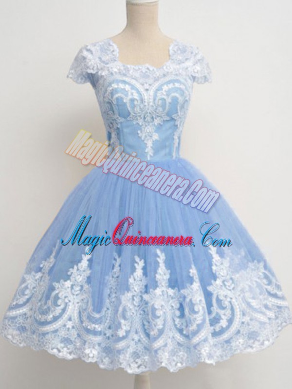 Light Blue Square Neckline Lace Vestidos de Damas Cap Sleeves Zipper