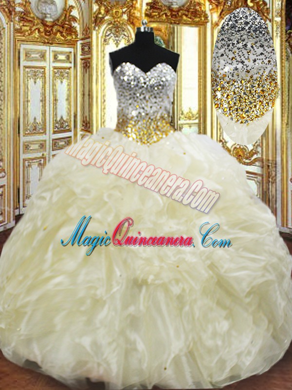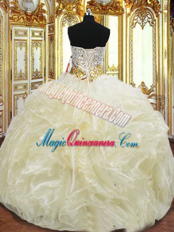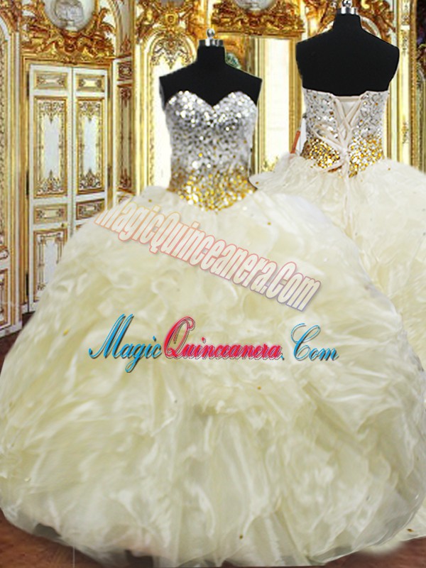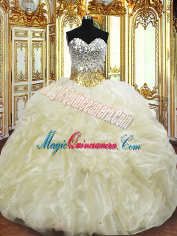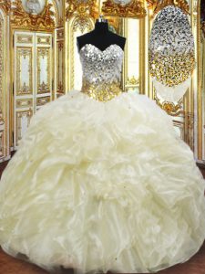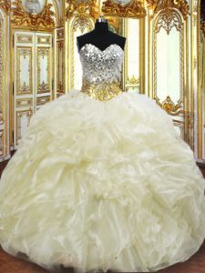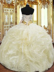Light Yellow Ball Gowns Beading and Ruffles Quinceanera Dresses Lace Up Organza Sleeveless Floor Length