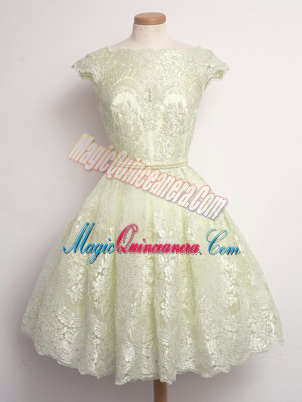 Light Yellow Cap Sleeves Lace Knee Length Vestidos de Damas