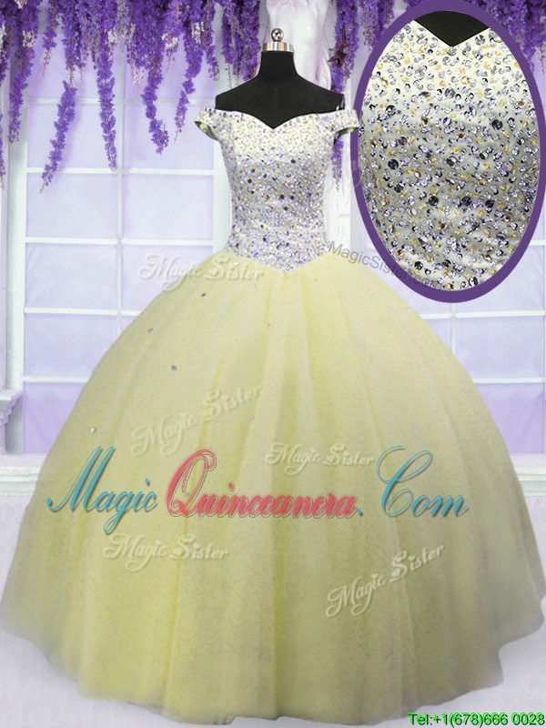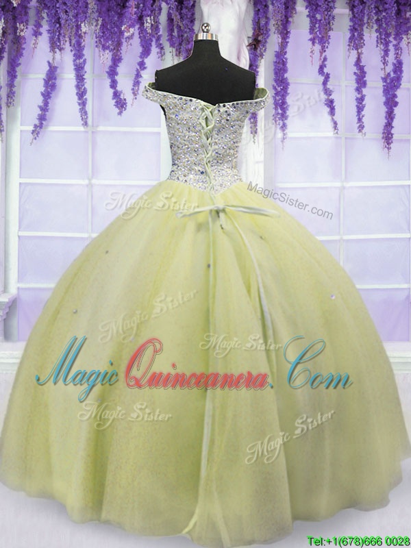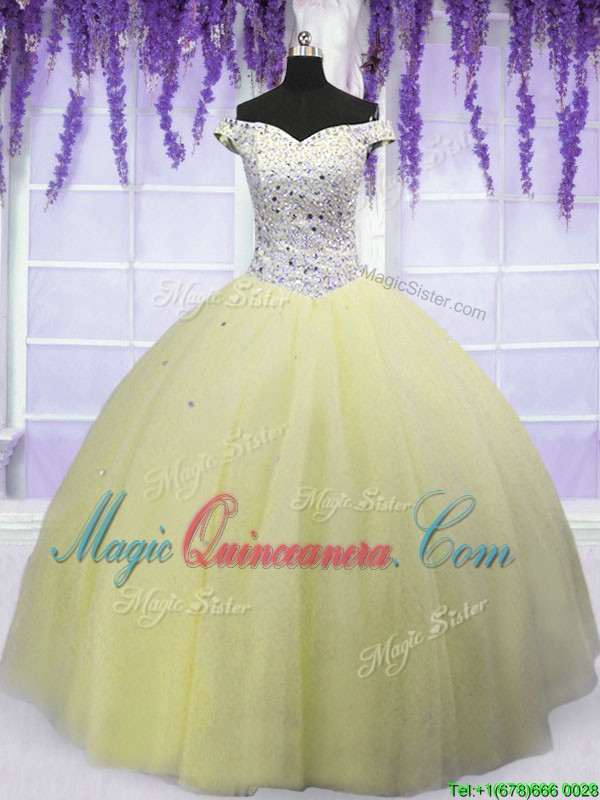 Light Yellow Off The Shoulder Lace Up Beading Vestidos de Quinceanera Short Sleeves