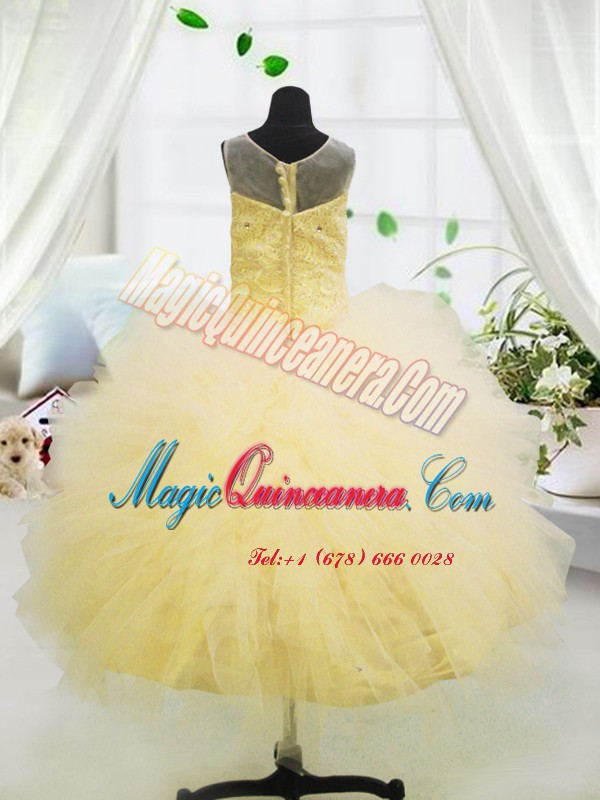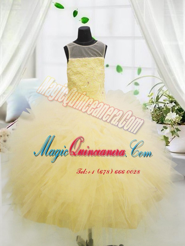 Light Yellow Scoop Neckline Beading and Appliques Kids Pageant Dress Sleeveless Zipper