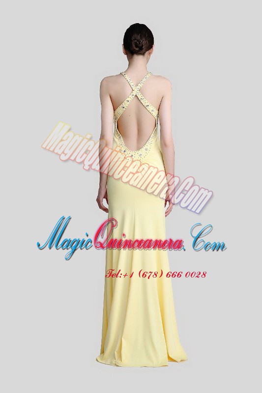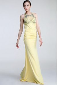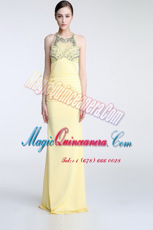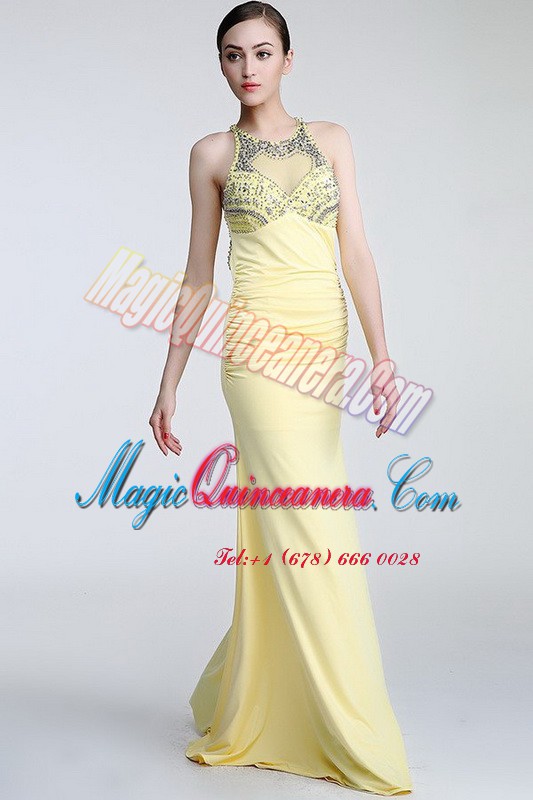 Light Yellow Scoop Neckline Beading and Ruching Mother Of The Bride Dress Sleeveless Criss Cross