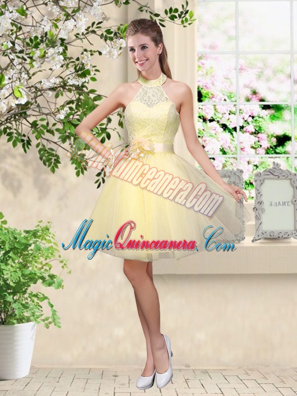 , Light Yellow Sleeveless Lace and Belt Knee Length Court Dresses for Sweet 16