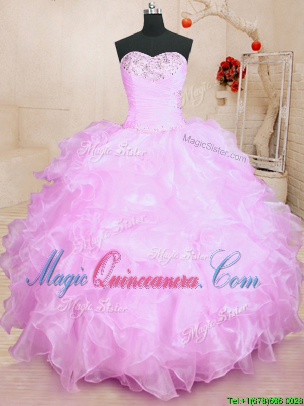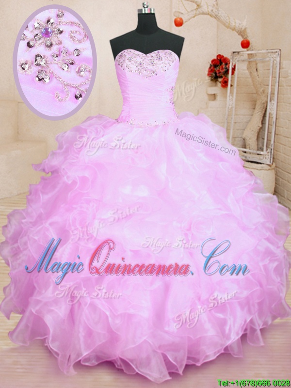 Lilac Ball Gowns Beading and Ruffles Quince Ball Gowns Lace Up Organza Sleeveless Floor Length