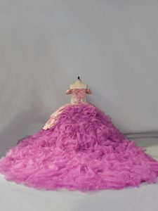 Lilac Ball Gowns Organza Off The Shoulder Sleeveless Embroidery and Ruffles Lace Up 15th Birthday Dress Chapel Train