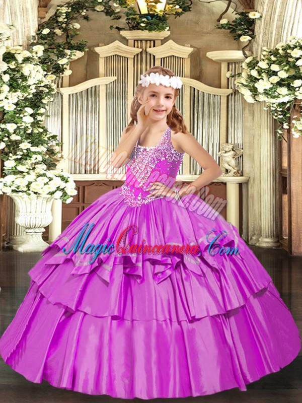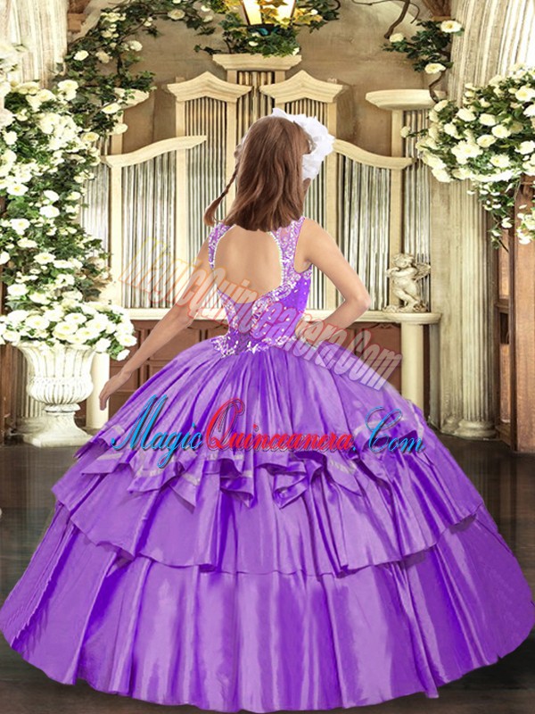 Lilac Ball Gowns Organza V-neck Sleeveless Beading and Ruffled Layers Floor Length Lace Up Pageant Gowns For Girls