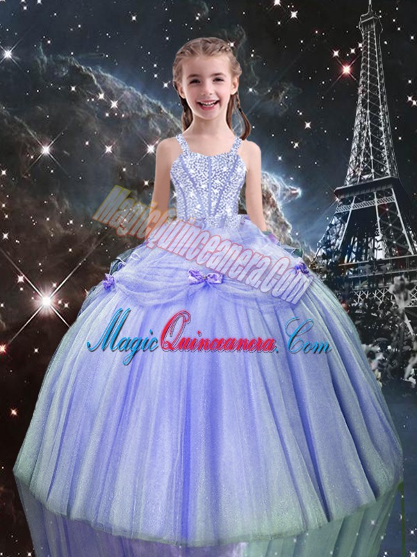 Lilac Tulle Lace Up Straps Sleeveless Floor Length Pageant Gowns Beading