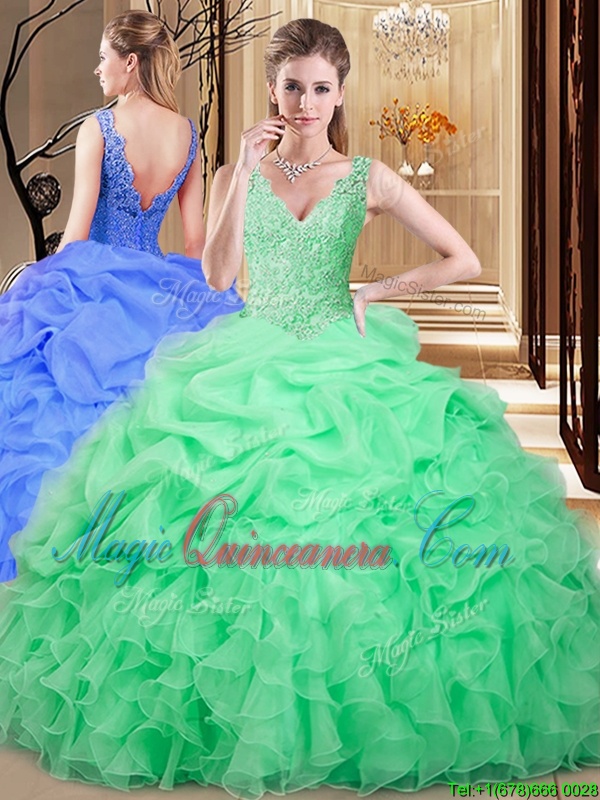 Lovely Apple Green Ball Gowns V-neck Sleeveless Organza Floor Length Backless Lace and Appliques and Pick Ups 15 Quinceanera Dress