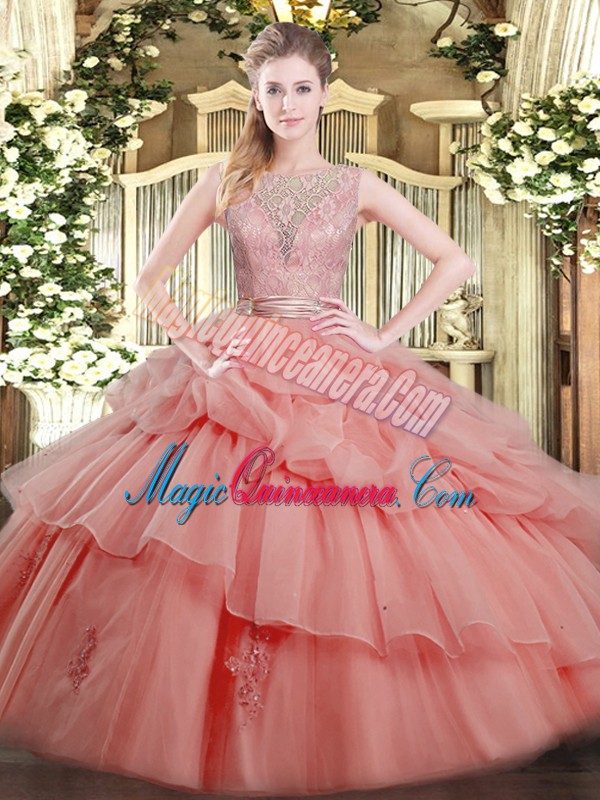 Lovely Ball Gowns 15th Birthday Dress Watermelon Red Scoop Tulle Sleeveless Floor Length Backless