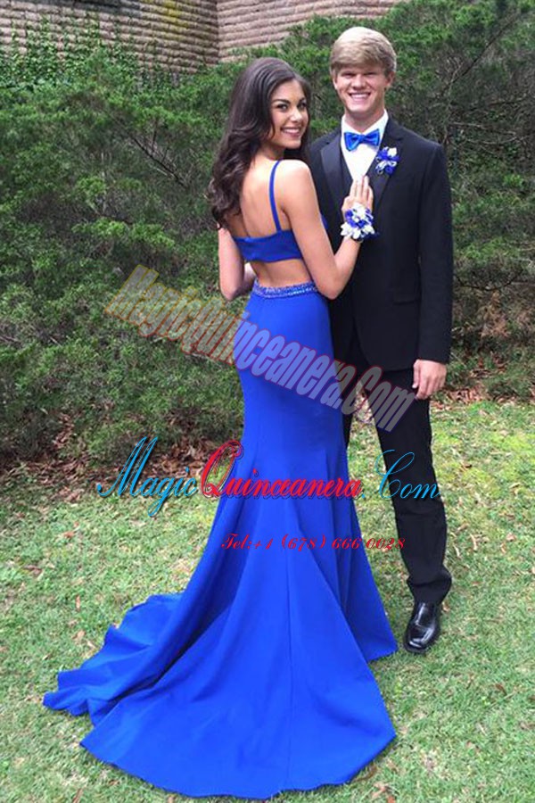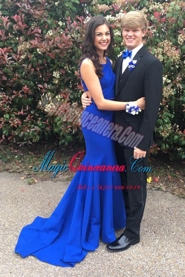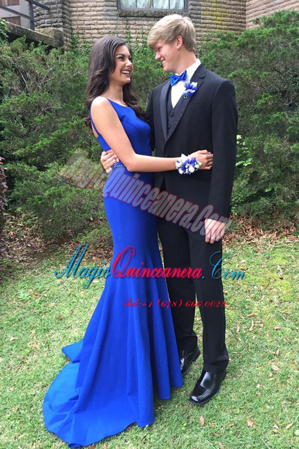 Lovely Mermaid Bateau Sleeveless Mother Of The Bride Dress With Train Sweep Train Beading Royal Blue Elastic Woven Satin - Magic Quinceanera