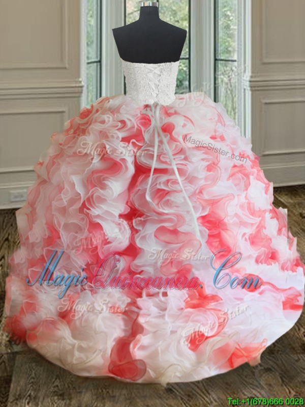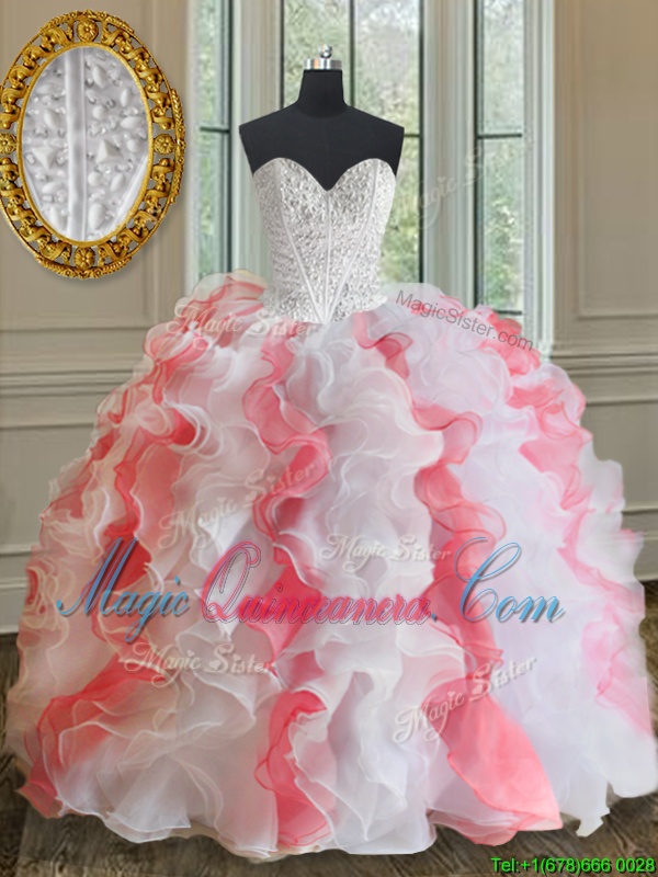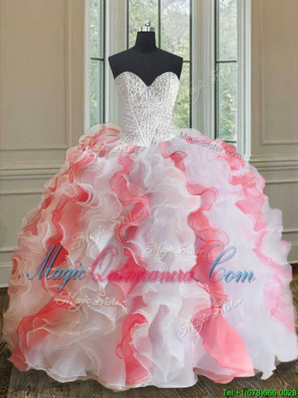 Lovely Pink And White Lace Up Sweetheart Beading and Ruffles Quinceanera Gown Organza Sleeveless