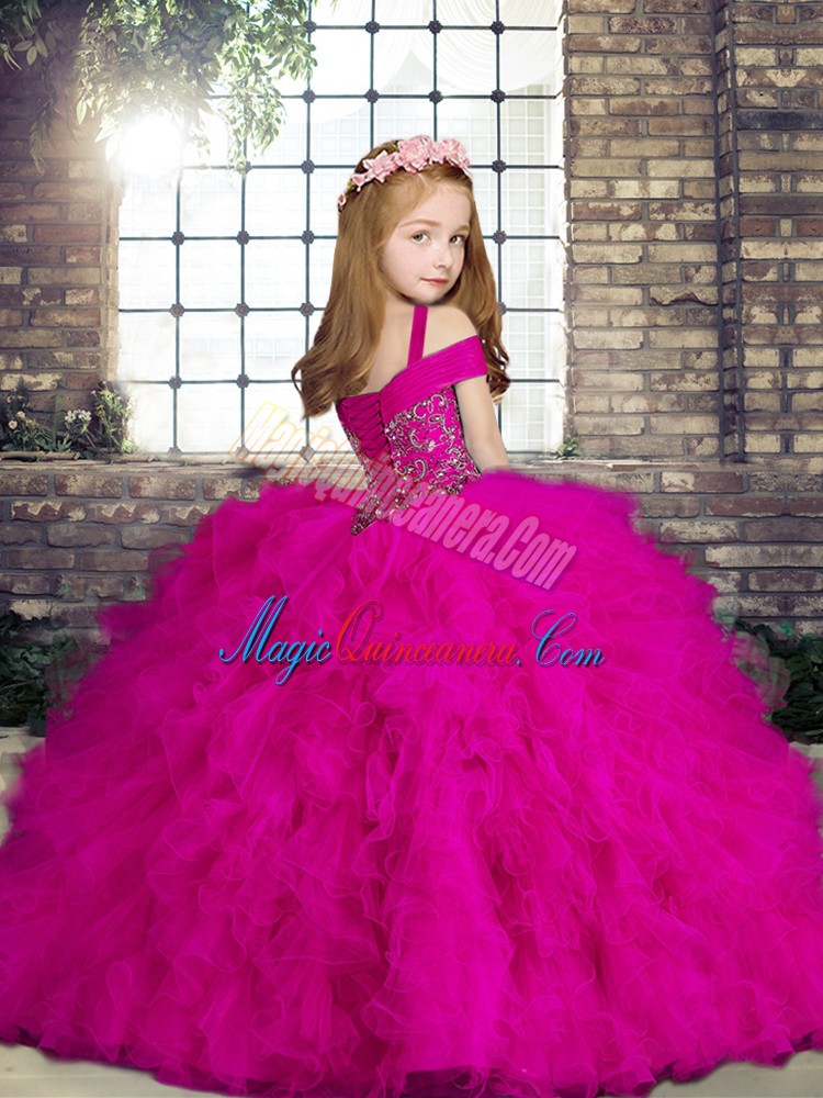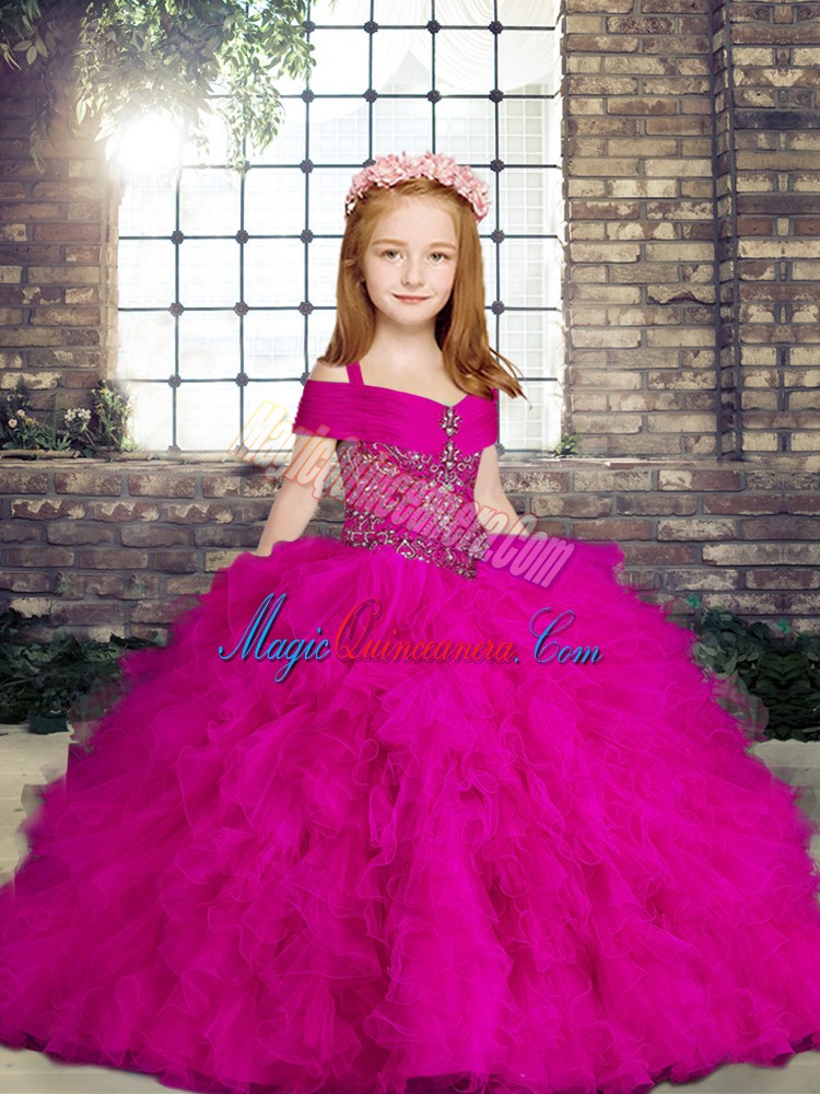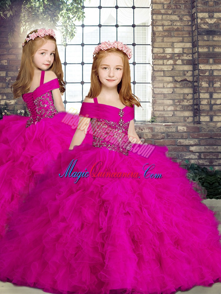 Lovely Straps Sleeveless Kids Formal Wear Floor Length Beading and Ruffles Fuchsia Tulle