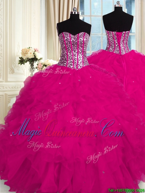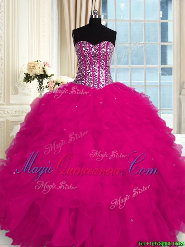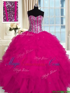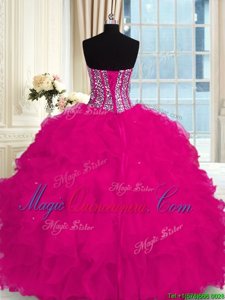 Low Price Fuchsia Ball Gowns Organza Sweetheart Sleeveless Beading and Ruffles Floor Length Lace Up Quinceanera Gowns