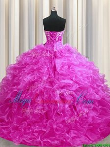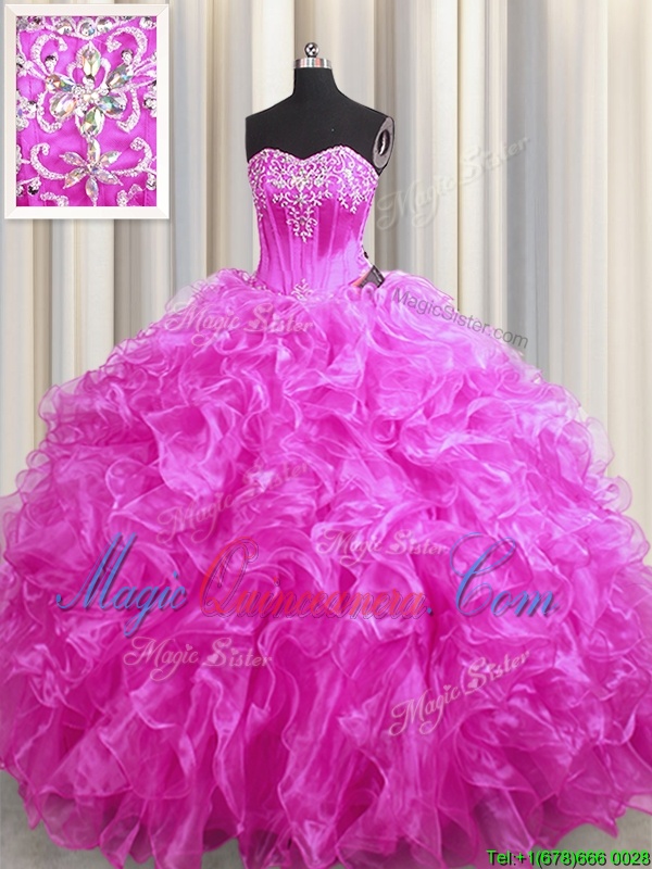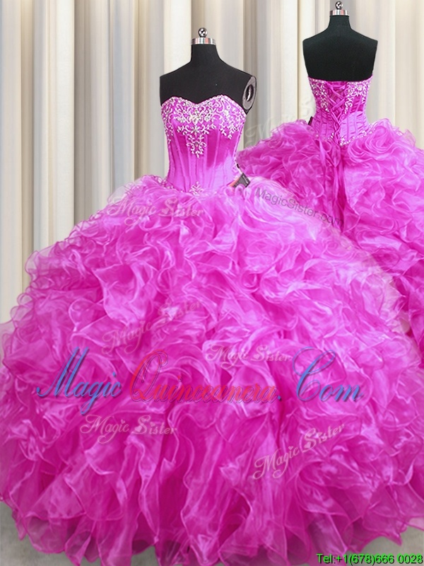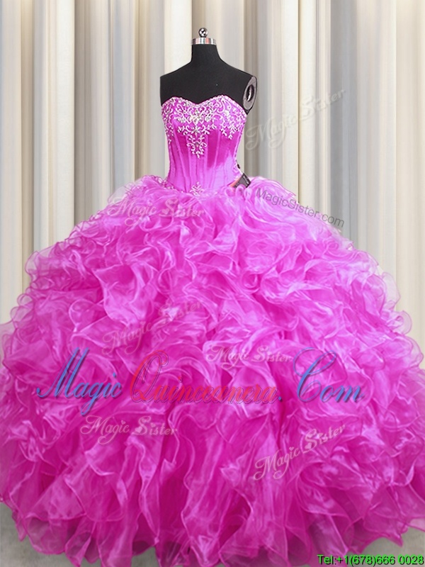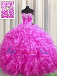 Low Price Fuchsia Sleeveless Sweep Train Beading and Ruffles 15th Birthday Dress